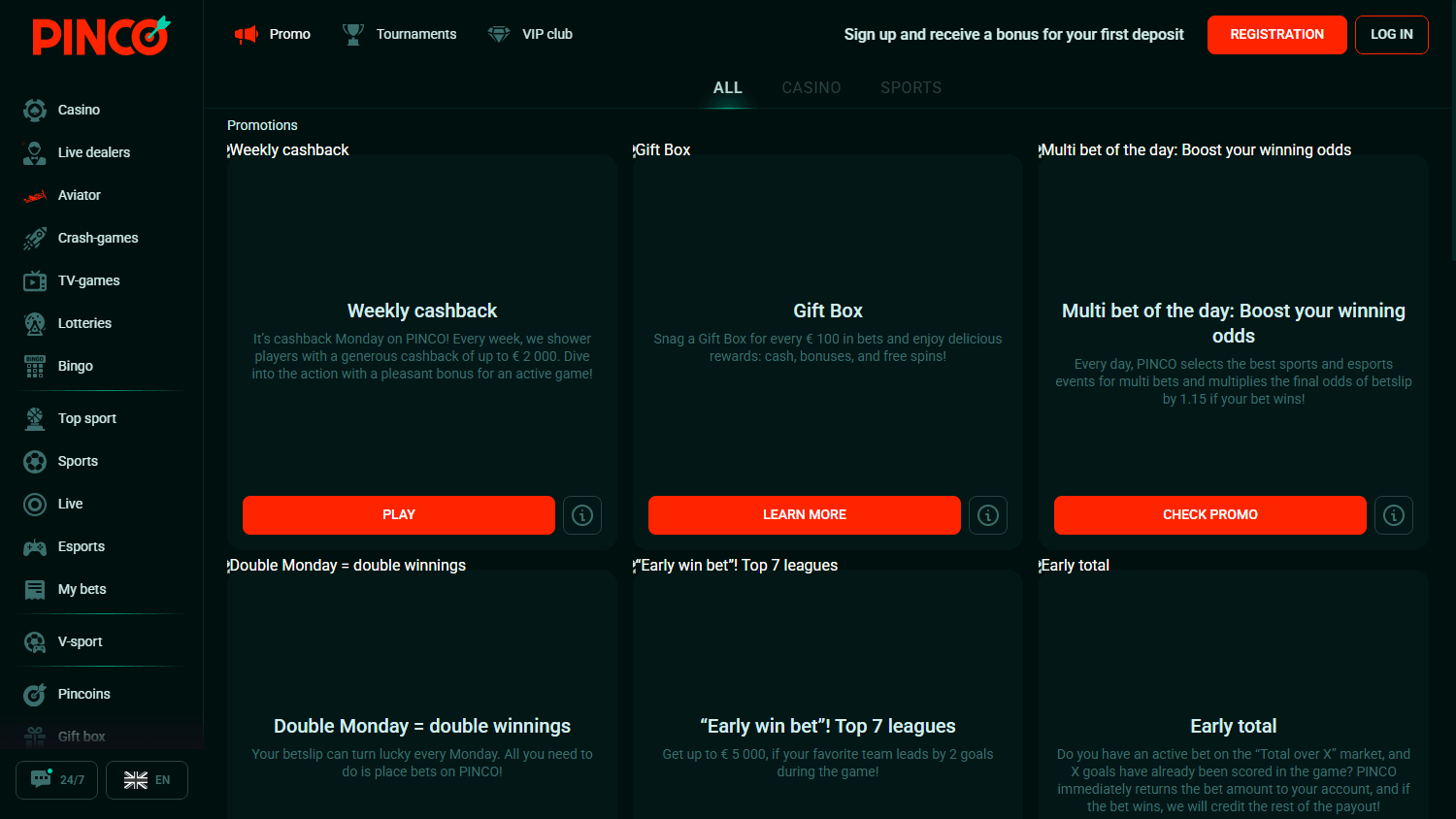 İcmalımız zamanı bəzi şübhəli qaydalar və ya müddəalar aşkar etdik və buna görə də Pinco Kazino saytının Şərtlərini əsassız hesab edirik.